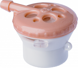 B PRIMEDI-LOW-RESISTANCE-VALVE mit geringem Widerstand (weiße Silikonmembran); geringer Anblasdruck reicht zum Verschliessen des Ventils aus - Während der Atmung kann die Luft ungehindert das Sprechventil passieren. Erst der erhöhte Anblasdruck bei der Expiration führt zu einem Verschließen der Silikonmembran. Die Expirationsluft wird dann durch die Stimmprothese bzw. den Kehlkopf zur Stimmbildung weitergeleitet